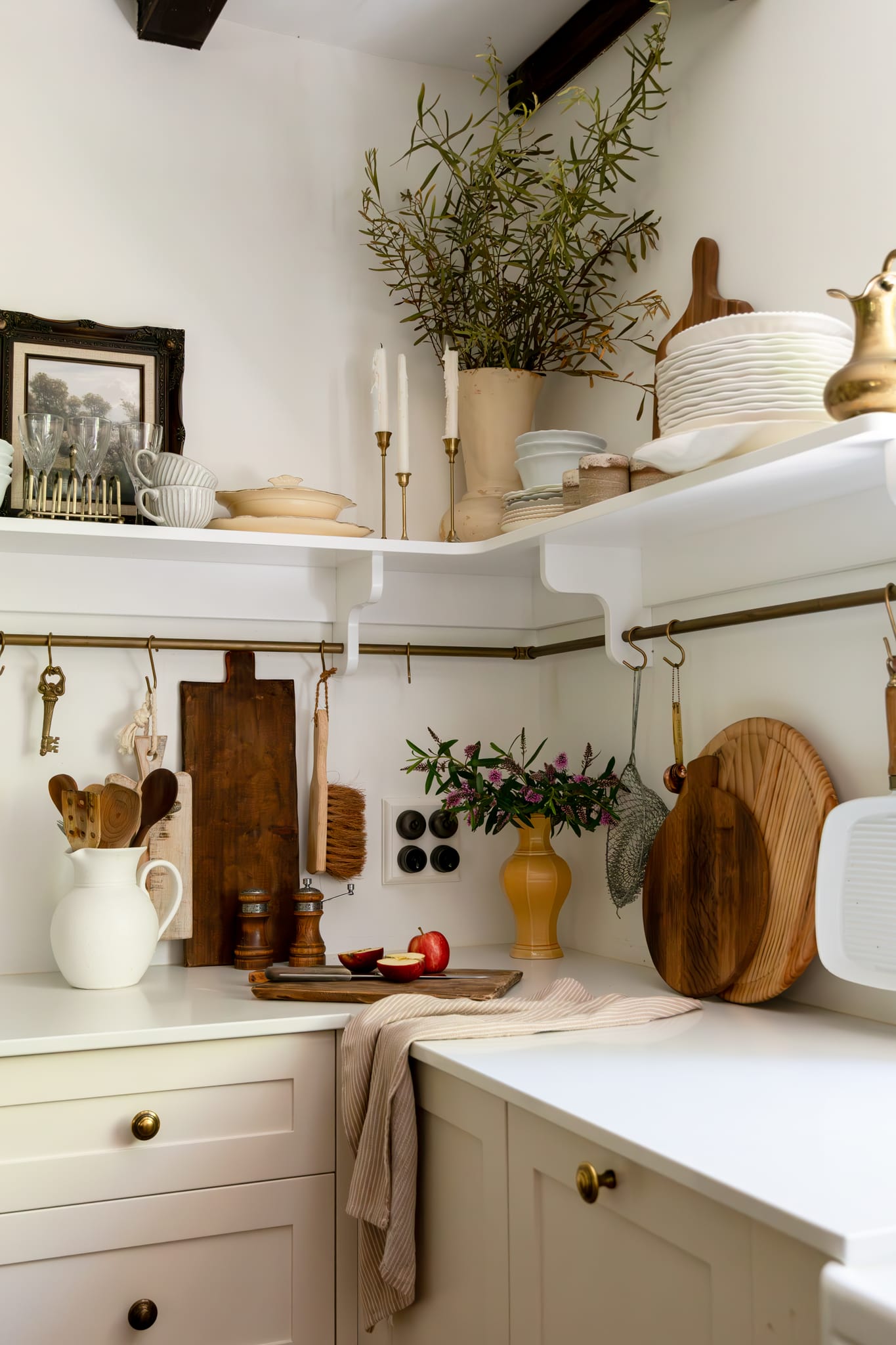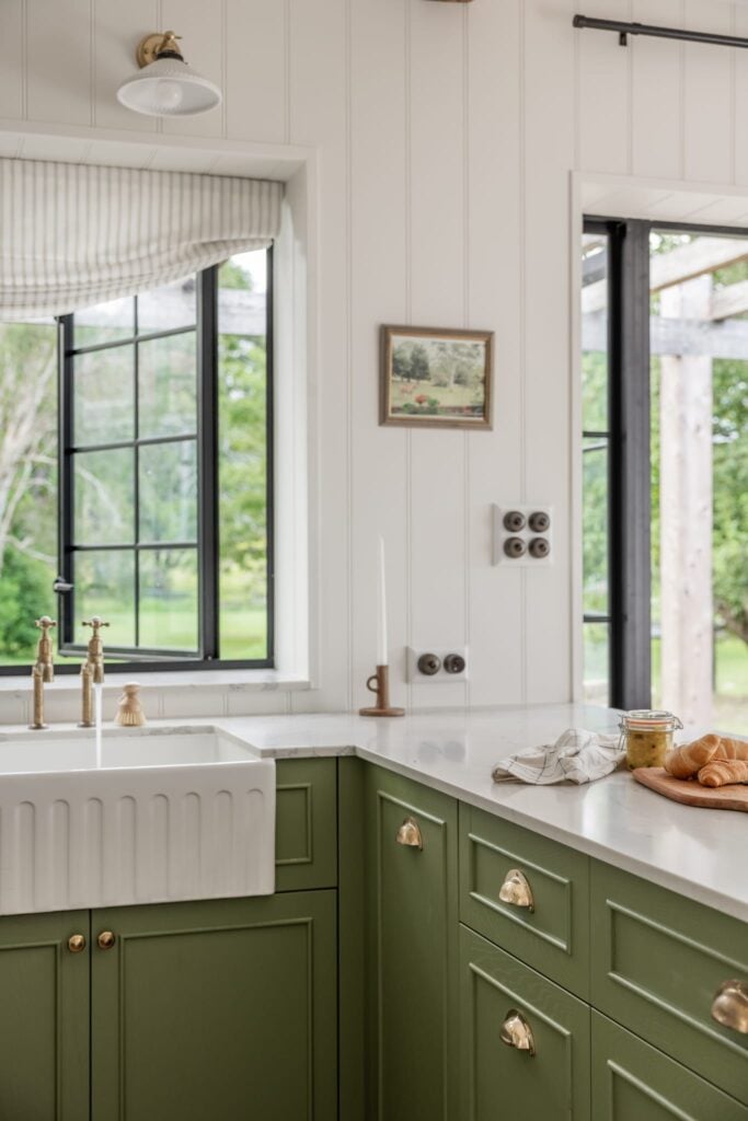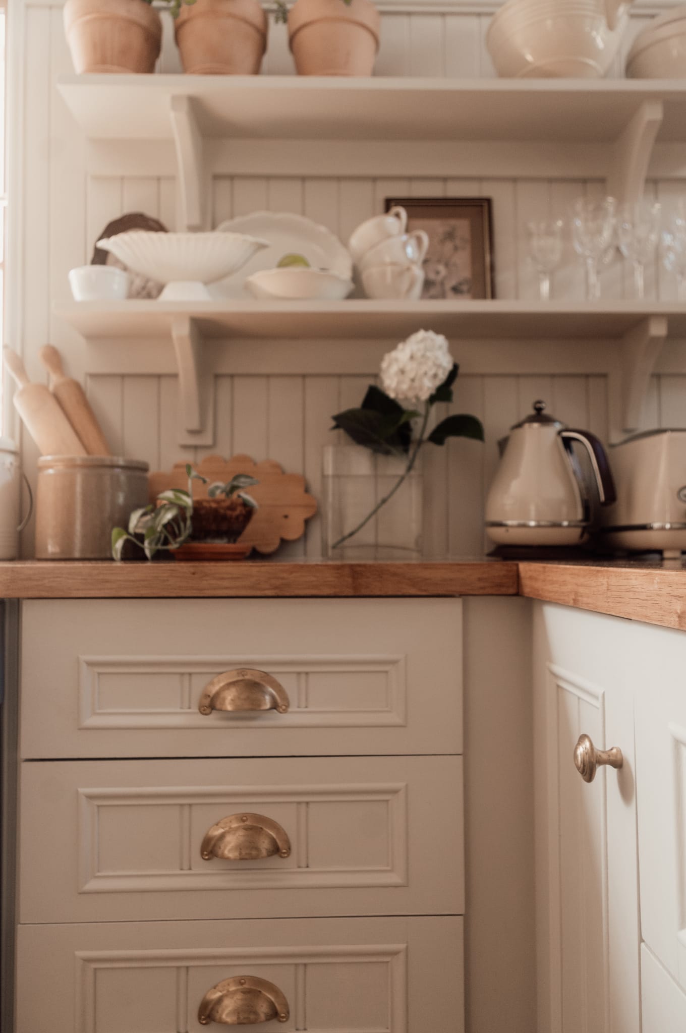 To transform a kitchen into the farmhouse-style the owner wanted, the drawers were elevated with TradCo’s Unlacquered Satin Brass Domed Cupboard Knobs and shell-like Classic Drawer Pulls, their classic forms and material linking new with old.