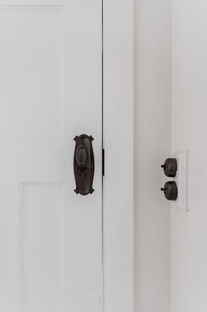 The fact that every example of TradCo hardware gives the impression of being an original fitting (the period brass light switches and front door lever Bliss selected are cases in point) worked perfectly with the atmosphere she was trying to create. “Modern switches would have felt out of place in this space,” she notes. “We went with TradCo’s traditional light switches and the classic wooden blocks to bring our ‘restored’ vision to life. It is nearly impossible to source vintage light switches like these, so to have TradCo supply traditional light switches was amazing.”