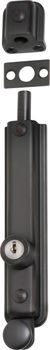 Key operated zinc alloy surface mounted bolt. Can be keyed alike.