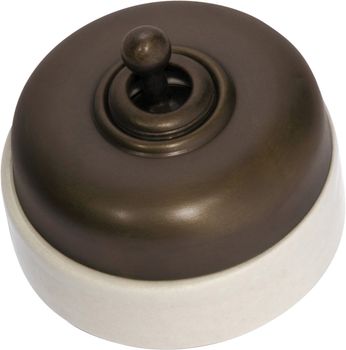 Traditional porcelain base light switches with brass covers and toggles in black or ivory porcelain.