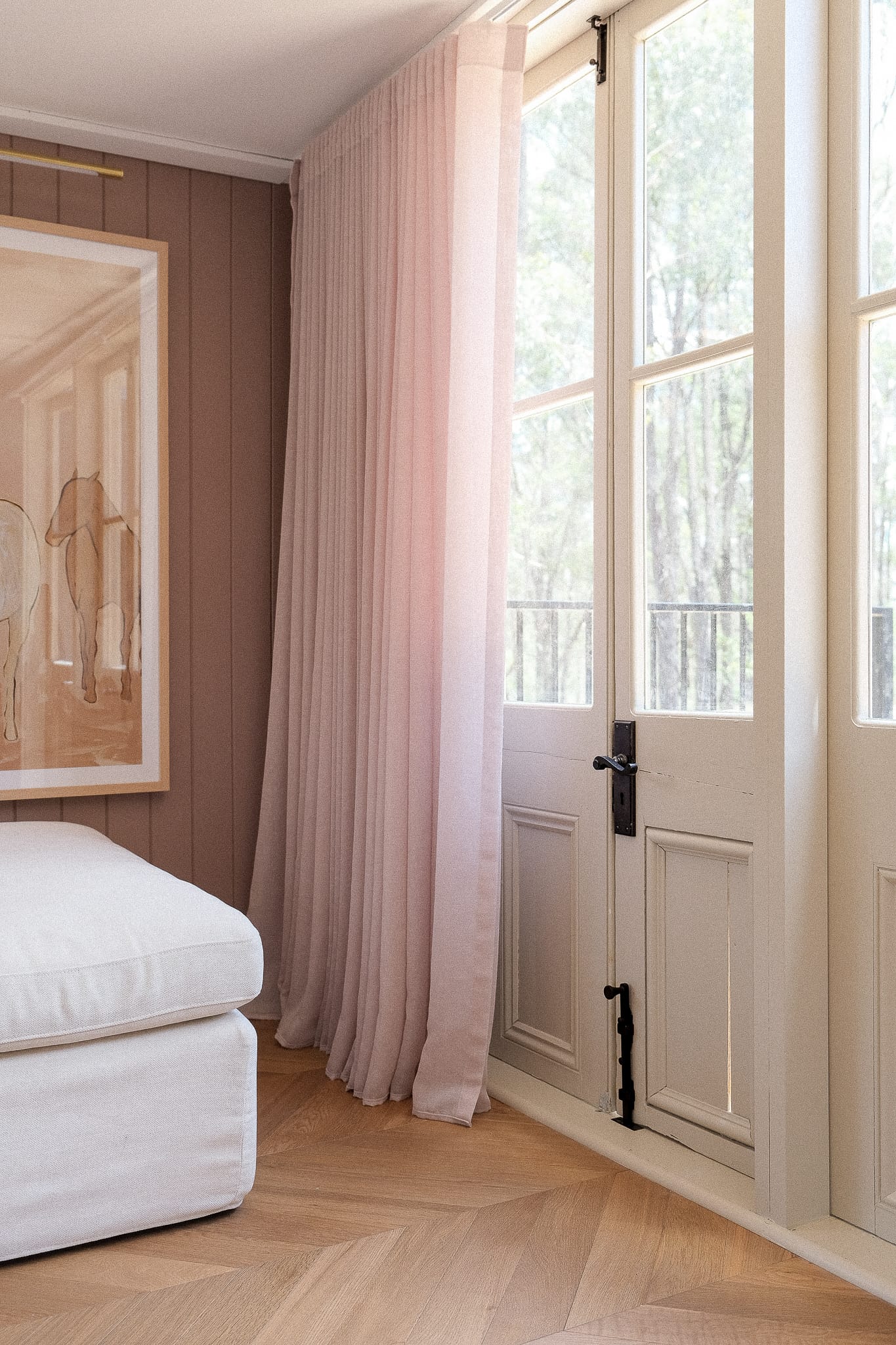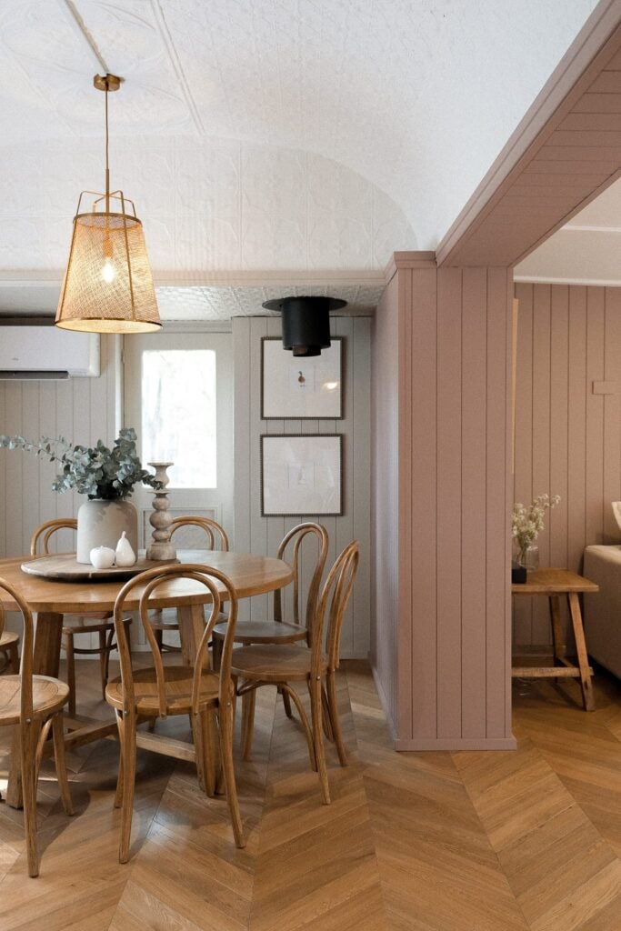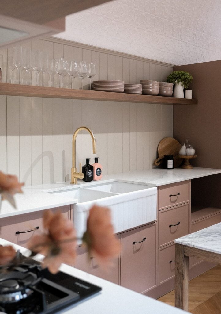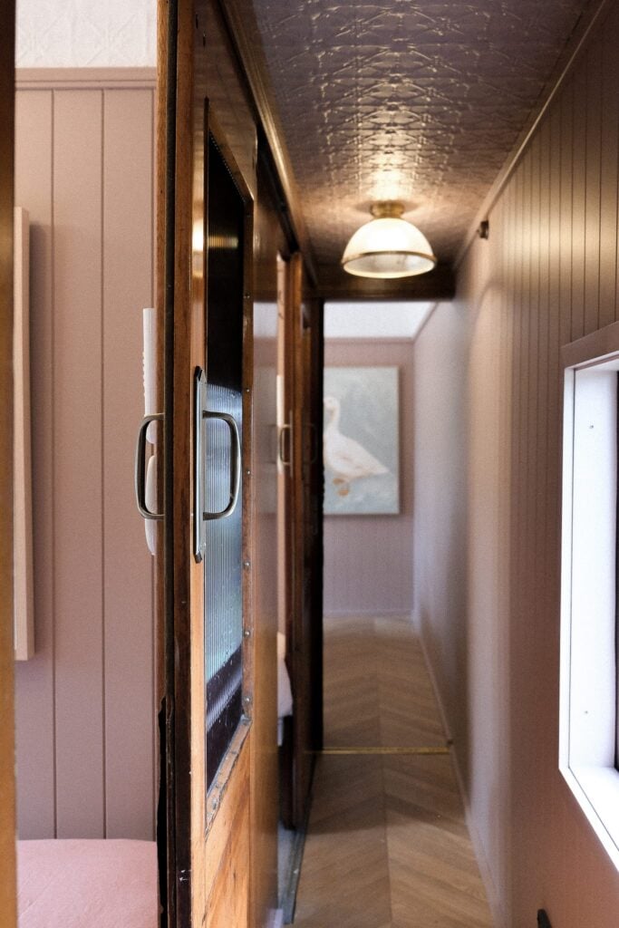 “Our vision for The Adelaide was deeply personal,” say the owners. “Dedicated to our daughter Addie, we imagined a carriage with feminine flair—a perfect girl-gang getaway—with tasteful, subtle nods of pink throughout.” They also needed it to stay in-keeping with the four other train carriages they have transformed on their 25-acre property in New South Wales tourist-haven Pokolbin. “It was important that The Adelaide spoke to our other trains,” they continue, “blending seamlessly with their balance of traditional charm and modern comfort.”