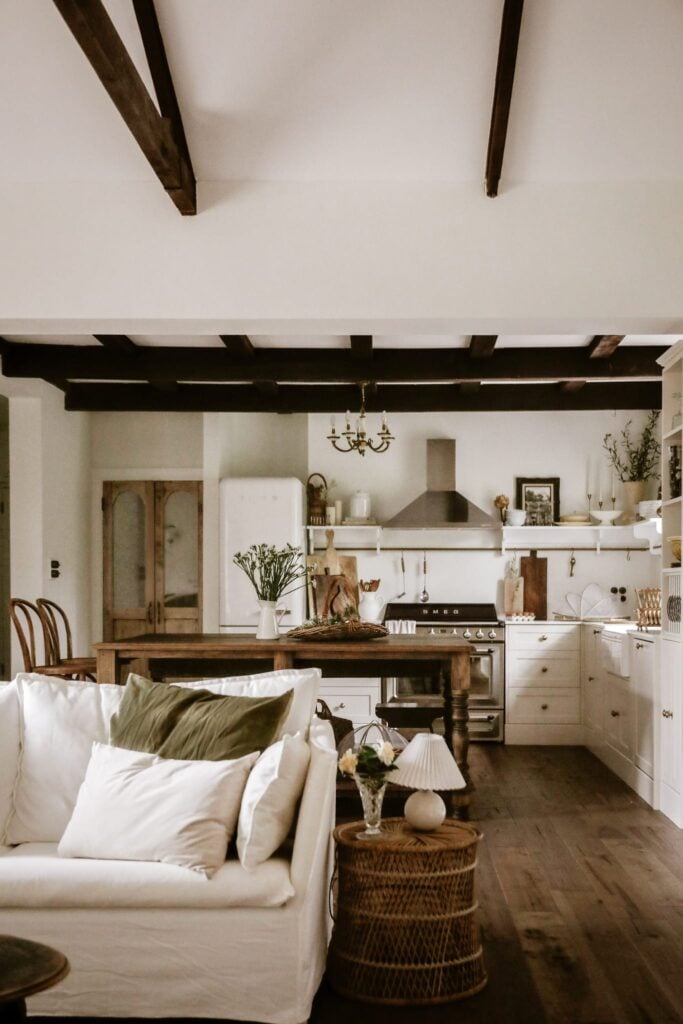 Neutral tones were used throughout the home, allowing the architectural elements and curated furnishings to be focal points of the space. Warm whites and contrasting trims complement the natural stone, rustic beams, and aged timber floors. The heart of the home, the kitchen, boasts custom-made cabinetry accented by TradCo’s sympathetic unlacquered brass cupboard knobs, creating a blend of old-world charm and contemporary touches.